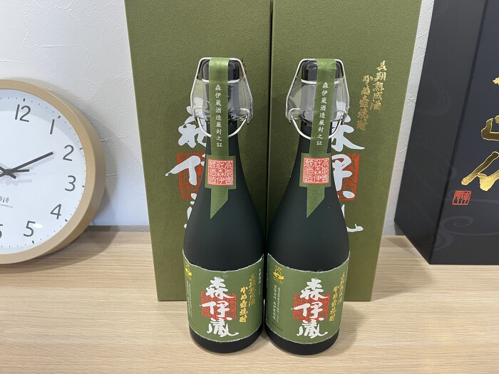 こちらのボトルは、通常の森伊蔵よりもさらに手間と時間をかけて造られる、長期熟成タイプのプレミアム芋焼酎です。森伊蔵酒造の地下洞窟の中で3年間じっくりと熟成させて仕上げており、洞窟内は年間を通して温度と湿度が安定しているため、焼酎の熟成に最適な環境とされています。また、通常のラベルと違い、高級感のある深緑色のラベルとなっています。焼酎は、度数が高い為、長期にわたって買取可能です。