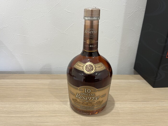 こちらのボトルは、1996年に10年表記にリニューアルした後、1998年に姉妹品として発売されたのが、サントリーリザーブ10年シェリー樽仕上げです。当時は、定価で約2,000円前後のボトルですが、終売していることとシェリー樽仕上げの事から、買取価格が高くなっております。サントリーリザーブは、現在でも現行品として販売されていますが、10年の表記されたボトルはございません。また、サントリーリザーブ10年の黒いボトルより、今ではシェリー樽の方が買取価格が高くなっております。今回は、キャップフィルムやラベル等が美品の為こちらの買取価格となりました。キャップフィルム破損、ラベルダメージ、液面低下は、減額、もしくは買取できない場合もございますのでご了承くださいませ。