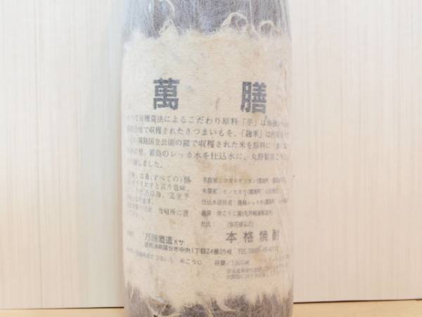 万膳酒造の幻の酒と言われている、タンク萬膳と言われている商品です。通常の萬膳や萬膳庵などとは、異なりラベルなどの作りも全然違います。焼酎の中でも、森伊蔵などと比べても、生産本数などタンク萬膳の方が圧倒的に少なく、珍しい商品になります。弊社で長年買取している中で、ラベルなどに大きなダメージが無い状態で買取をしたのは、1回のみになっております。